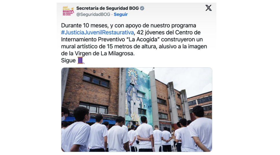 En Bogotá, la Secretaría de Seguridad en 2022 implementó un proyecto de arte urbano colaborativo dentro de una unidad del Sistema de Responsabilidad Penal Adolescente. Jóvenes privados de su libertad pintaron un mural de la Virgen de La Milagrosa como símbolo de protección, afecto y reconstrucción emocional. La obra resignifica el espacio como un lugar de cuidado, no solo de sanción.